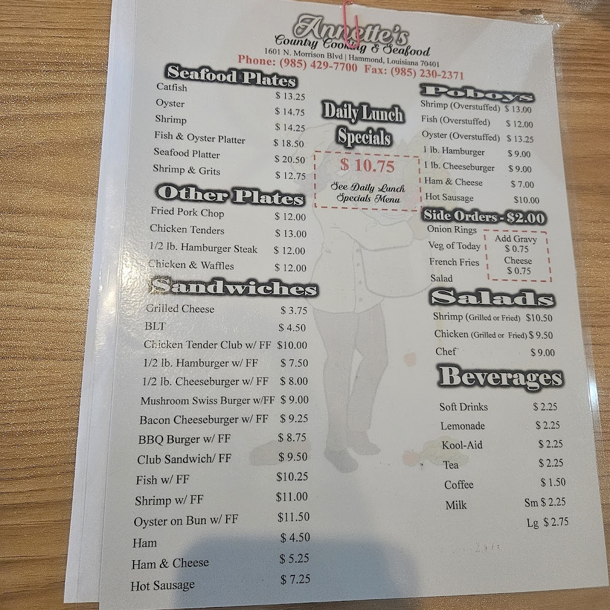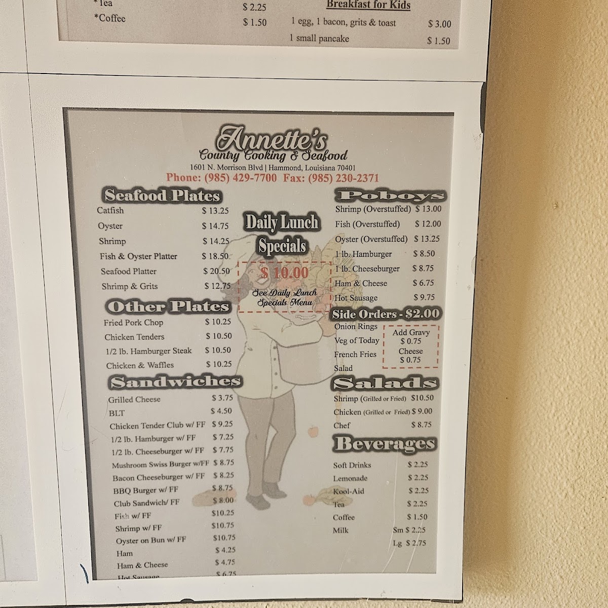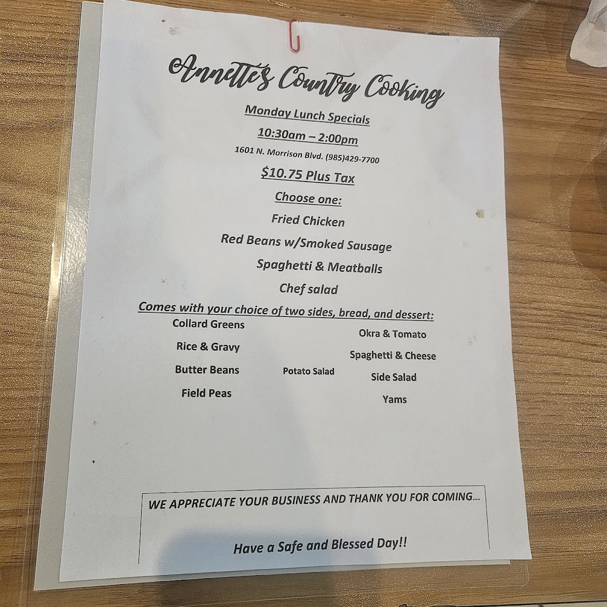Welcome to Annette's Country Cooking & Seafood, a charming gem nestled in Hammond, LA. This beloved diner offers a heartwarming menu that captures the essence of home-cooked meals, celebrated for its welcoming atmosphere and friendly service.